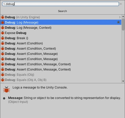为了方便测试Get Normal节点输出的内容与我们玩家与其接触方向的关系,我们可以使用“Debug: Log”节点来让Unity输出指定的信息到Console窗口: