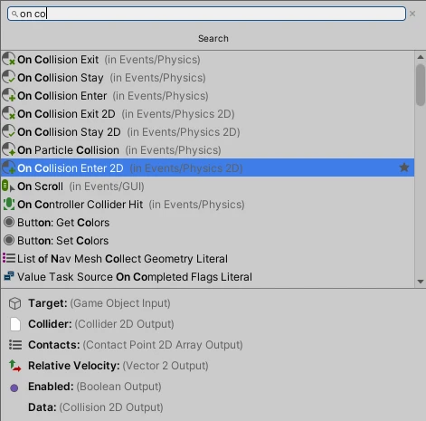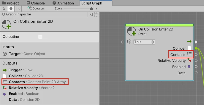 On Collision Enter 2D事件的触发时机和之前提到的On Trigger Enter 2D类似,只不过Trigger版本由Trigger模式的Collider触发,而Collision 版本则可以由非Trigger模式的Collider触发,且可以提供的信息比Trigger版本要更多。