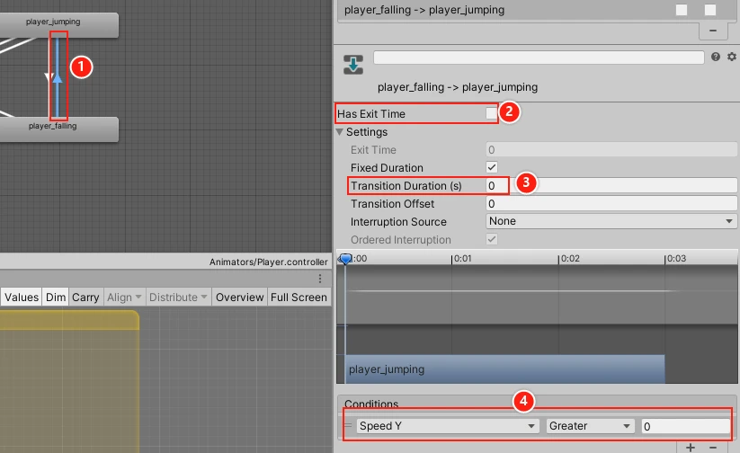 最后,为了让角色能在踩到敌人又跳起的过程中切换到正确的起跳动画剪辑,我们还需要在Player的Animator中添加一条从下落状态到起跳状态的过渡,如下图所示: