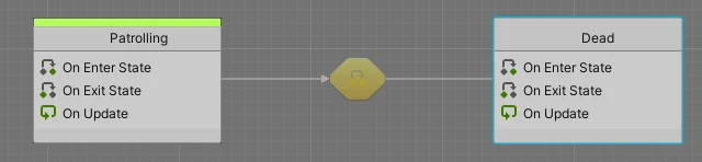 右击Patrolling结点,选择Make Transition,创建一个新的状态以及过渡,并将其重命名为Dead(死亡状态)。