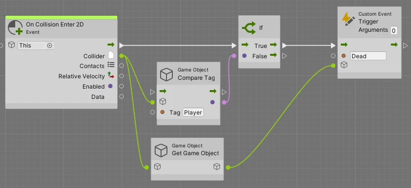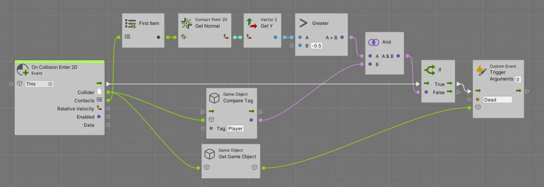 因此,我们只需要判断Get Normal节点输出的向量的Y分量小于0即可判定玩家是从上方接触敌人的。换句话说,触发玩家死亡的条件是:触碰玩家的同时接触点法线的Y分量大于-1(考虑到浮点精度的问题,实际上写成大于-0.5)。完整逻辑如下图所示: