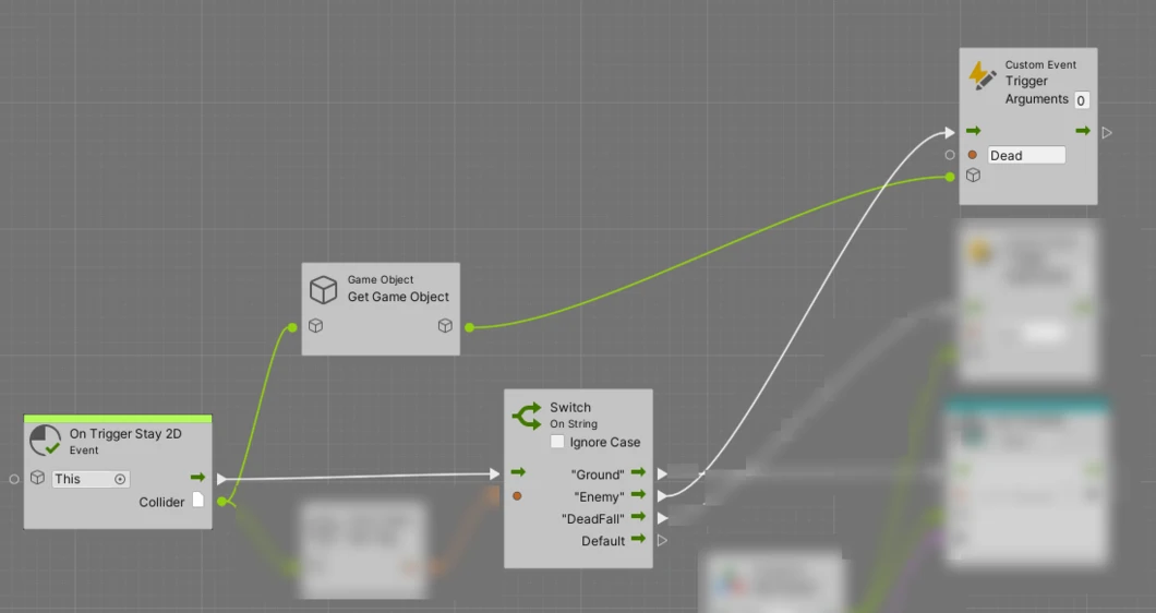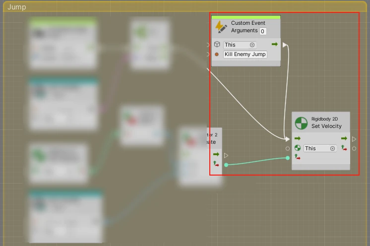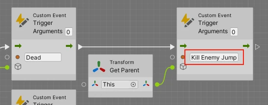 在Ground Check的脚本中找到让敌人死亡的逻辑部分,在后面接一个触发Player对象(Ground Check的父级对象)弹跳的自定义事件Kill Enemy Jump: