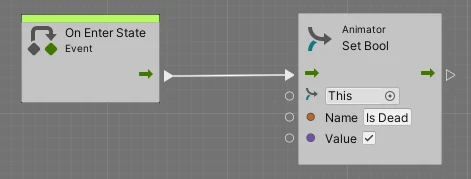 接着回到State Machine脚本,双击Dead结点来编辑死亡状态下的逻辑:目前只需要在进入状态时显示死亡的动画,也就是将之前设置的Animator的死亡参数置为真即可。