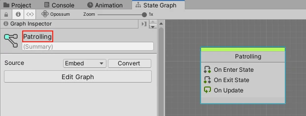 在Opossum对象下添加State Machine组件并创建一个State Machine可视化脚本,并将自动创建的Start状态重新命名为巡逻(Patrolling)状态。