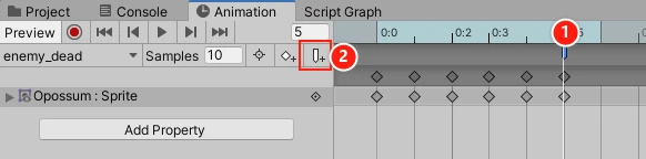 在Animation窗口找到敌人死亡动画剪辑并定位到最后一帧,选择图中2处的按钮(Add Event,添加事件):