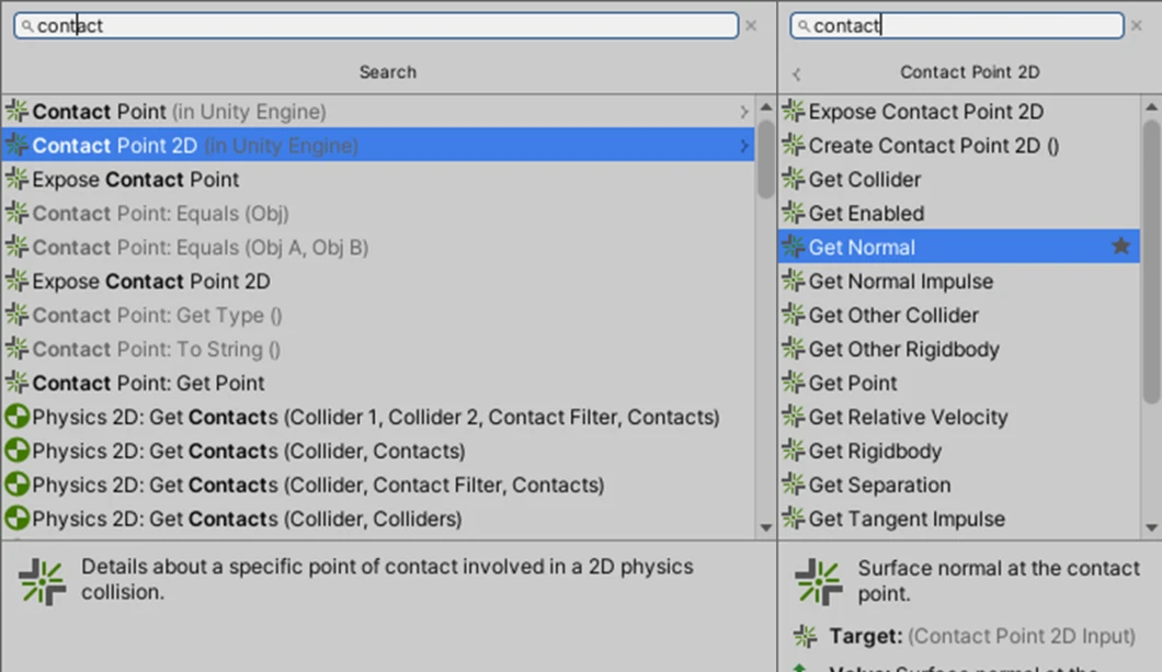 从Contacts属性连出,创建一个First Item节点,然后继续连出,搜索Contact Point,找到子菜单下的Get Normal(获取接触点表面法线)方法。