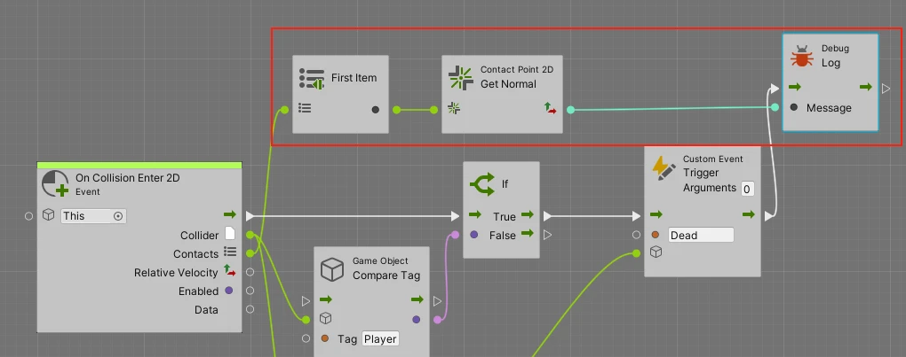 - 当Player从上方触碰敌人时,Get Normal节点输出的是(0,-1);