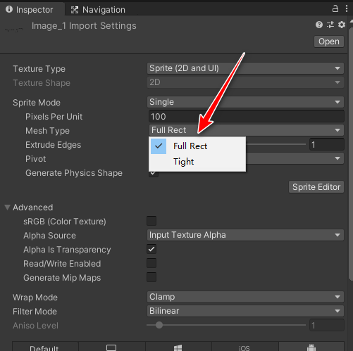 对于这种单个的会残留其他图片的Sprite, 我们将它的MeshType从Tight改为FullRect即可. 即针对单个图片我们不使用紧凑排版,而是保留它的全部,包括透明的部分,也就是说这张图是多大尺寸,在图集里面就是多大尺寸,保留其全部细节,这样打出来的图集就不会出现上面的加载出来带有残影的问题.虽然对于这个图片来说是挺浪费空间的,但是对于整个图集来说,能够避免所有的图片间隔都增大,还是能够接受的.