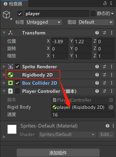 保存好脚本后,就可以在Unity的检查器窗口看到这两个成员的接口,我们可以在Unity指定接口挂载到上面地方,这里我们将检查器窗口上的Rigidbody 2D组件拖动到