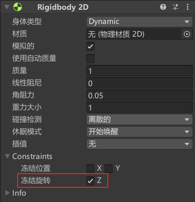 (Freeze Rotation)打上勾(2D游戏的旋转只有绕Z轴旋转,所以只有一个Z轴的选项)。