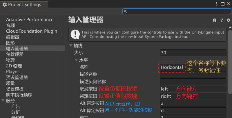 这一栏,展开轴线(Axes)设置项,可以看到Unity预设的若干个输入按键,中文版翻译的有些问题,我这里解释在图中了。