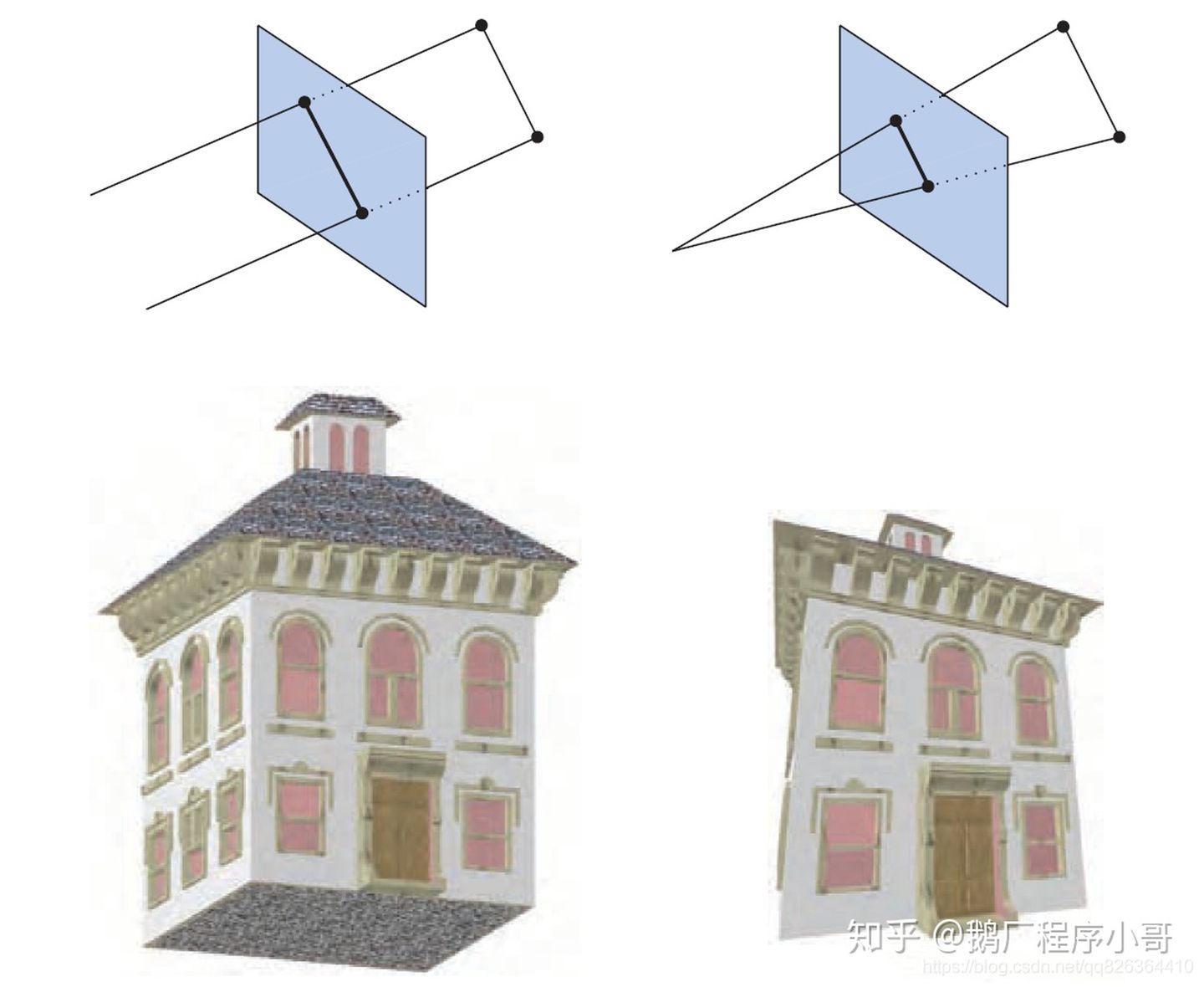 - 透视投影。相比之下,透视投影比正交投影复杂一些。在这种投影中,越远离摄像机的物体,它在投影后看起来越小。透视投影的变换其实就是模拟人类感知物体的方式。