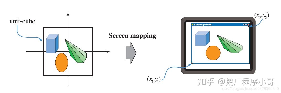 进入到这个阶段时,每个图元的x和y坐标变换到了屏幕坐标系中,称为窗口坐标系。