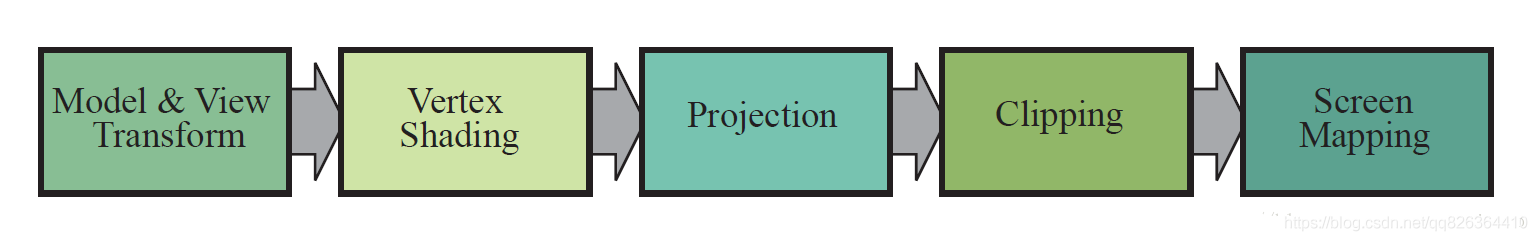 几何阶段主要负责大部分多边形操作和顶点操作。可以将这个阶段进一步划分成如下几个功能阶段: