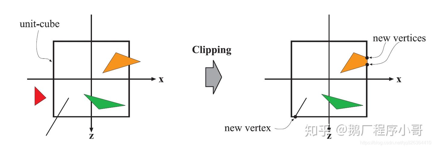 - 当图元完全位于视体外部,不会进入下一个阶段,可直接丢弃,因为它们无需进行渲染。