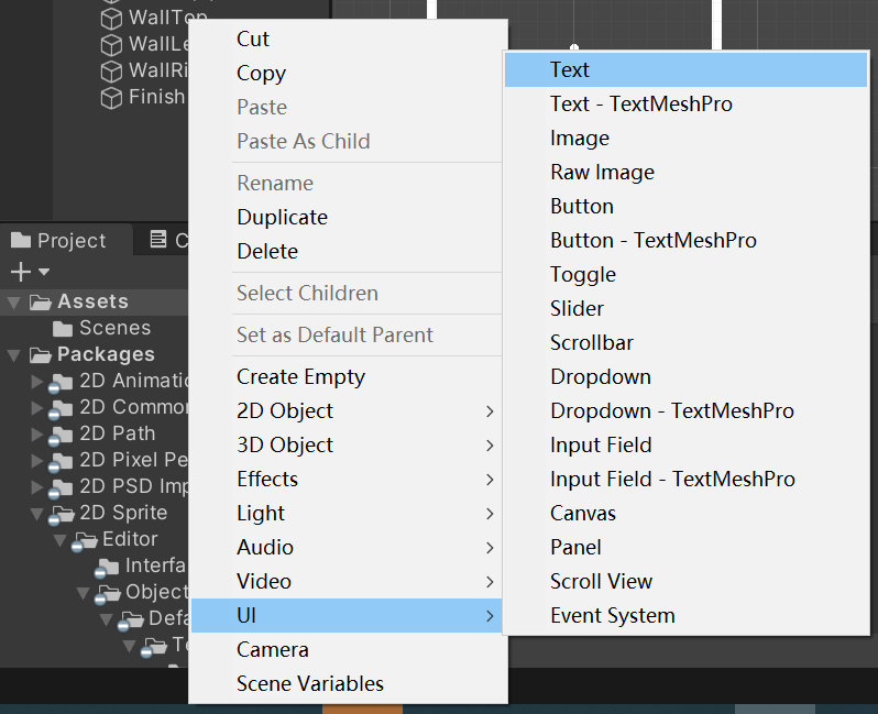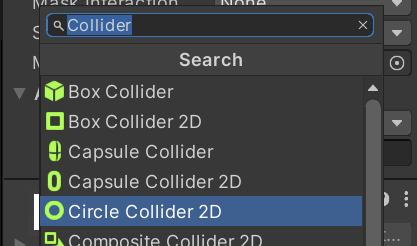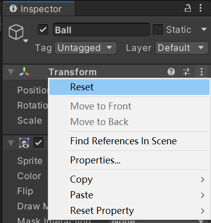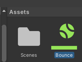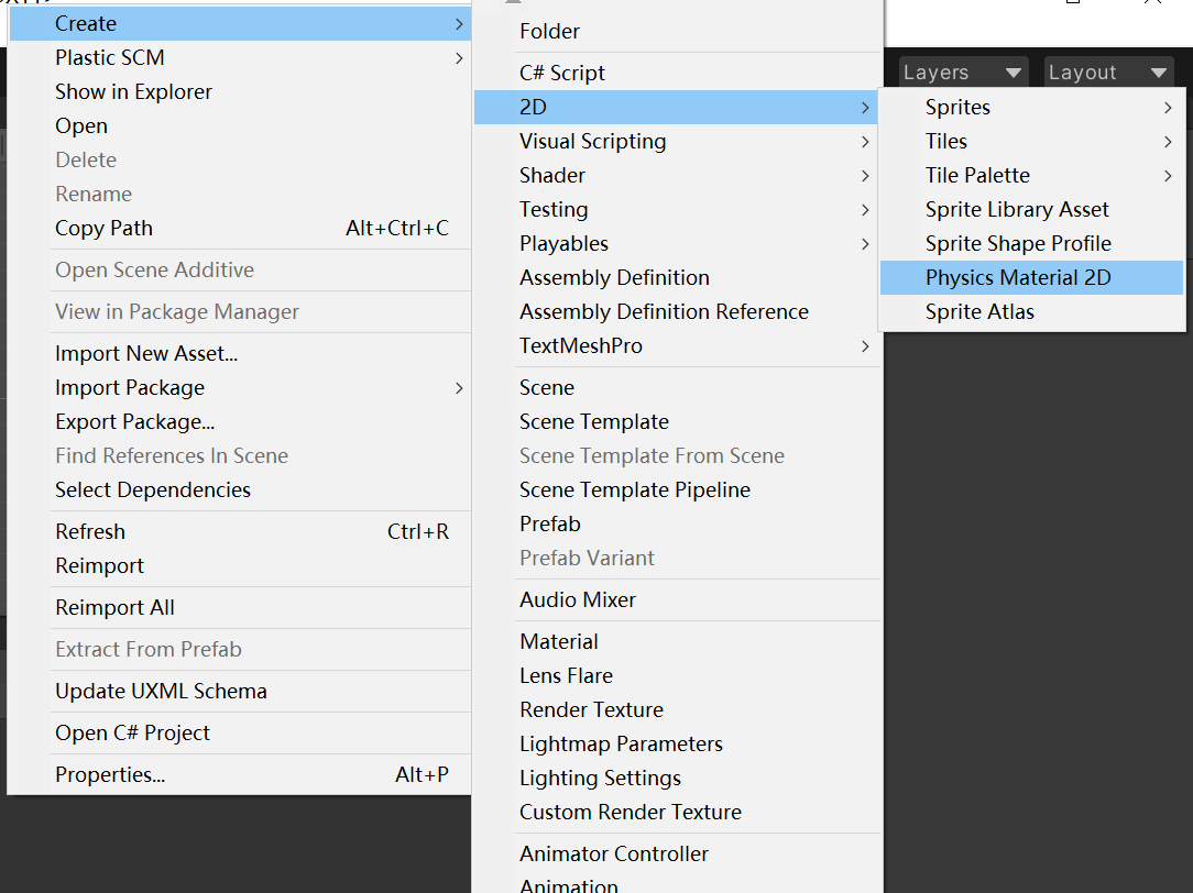 为Ball新建一个材质,将有反弹功能: Project->Assets->空白处右击->Create->2D->Pysics Material 2D: 注意,不要错误新建3D材质哦。