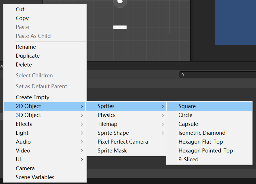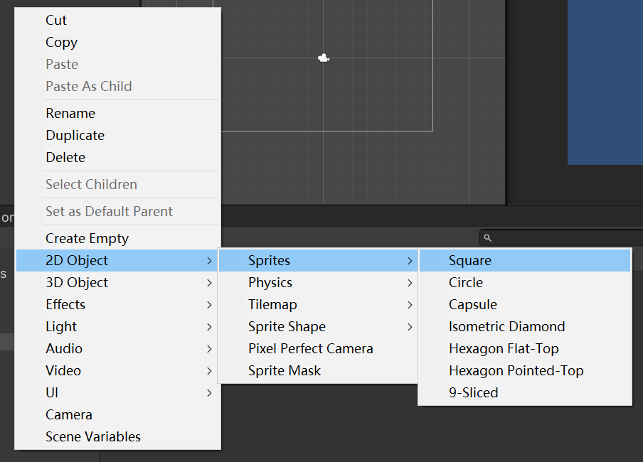 新建一个方形角色, Hierarchy->2D Object->Sprites->Square: