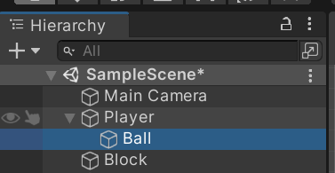 将Ball拖拽为Player的下级, 让他们变为组合,有共同移动的功能, 没有发球前,两者是共同移动的: