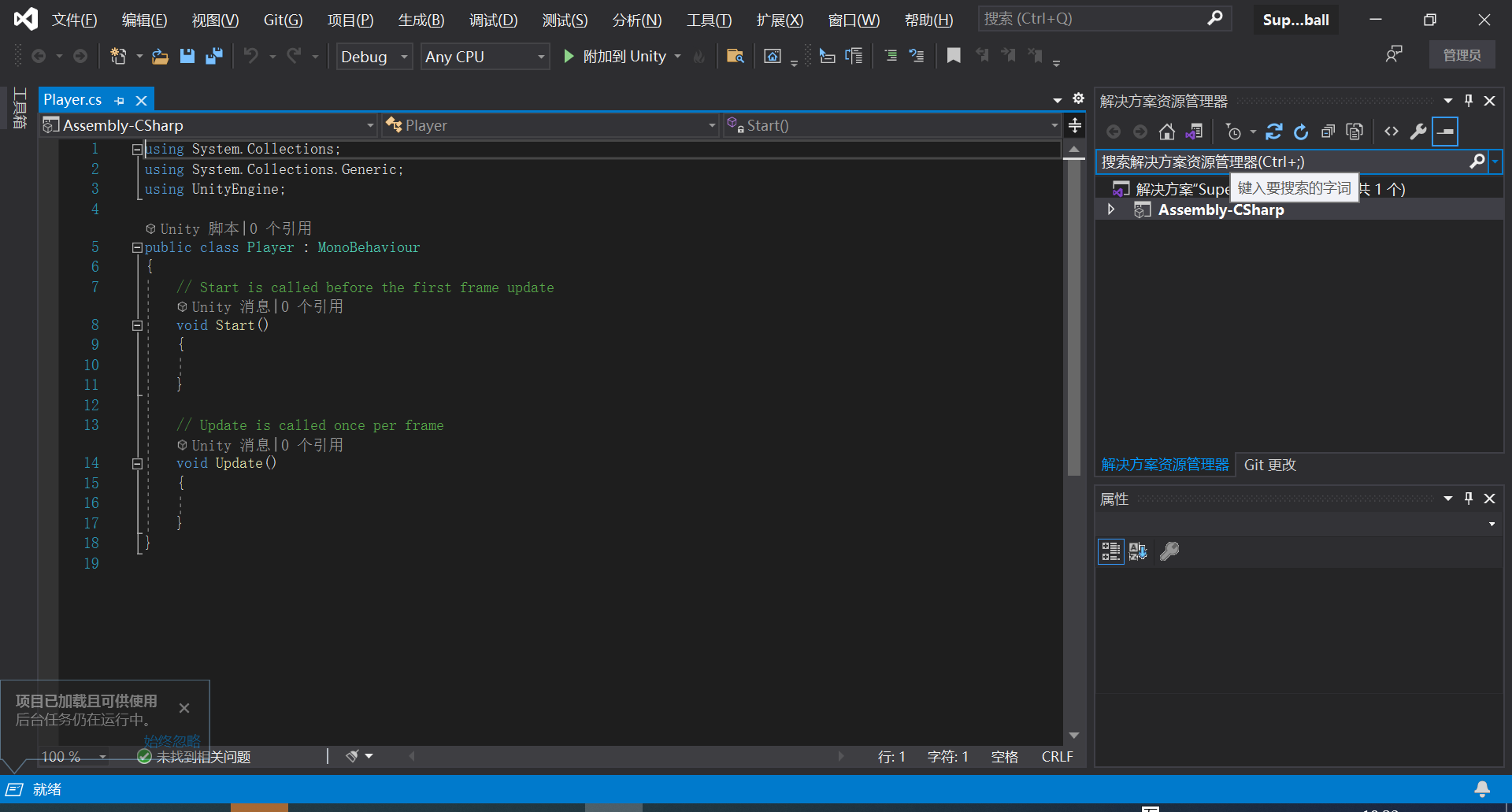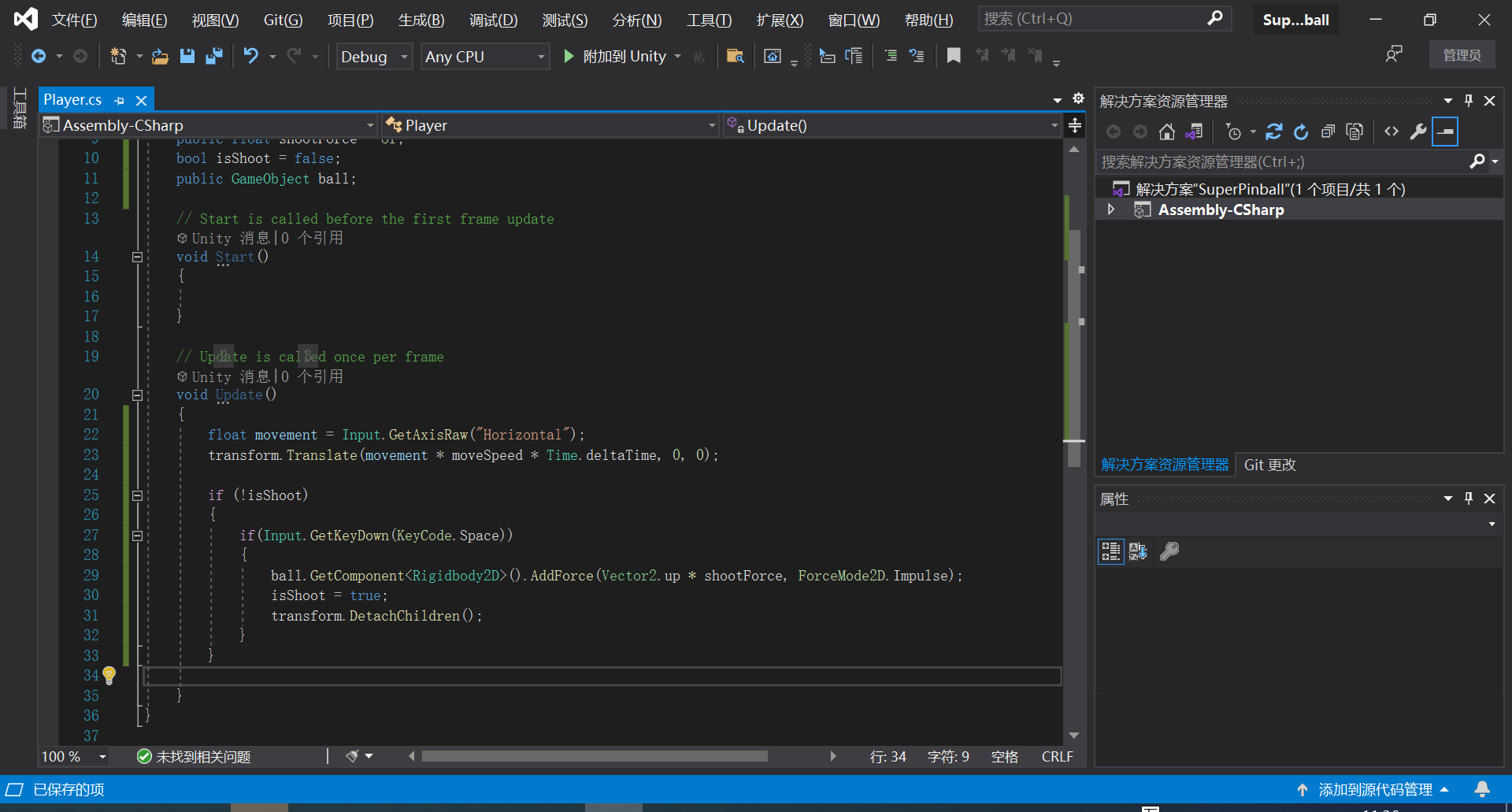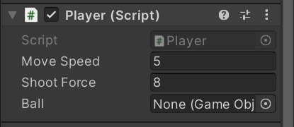 继续增加代码, 为Player增加发球功能: using System.Collections; using System.Collections.Generic; using UnityEngine; public class Player : MonoBehaviour { public float moveSpeed = 5f; public float shootForce = 8f; bool isShoot = false; public GameObject ball; // Start is called before the first frame update void Start() {