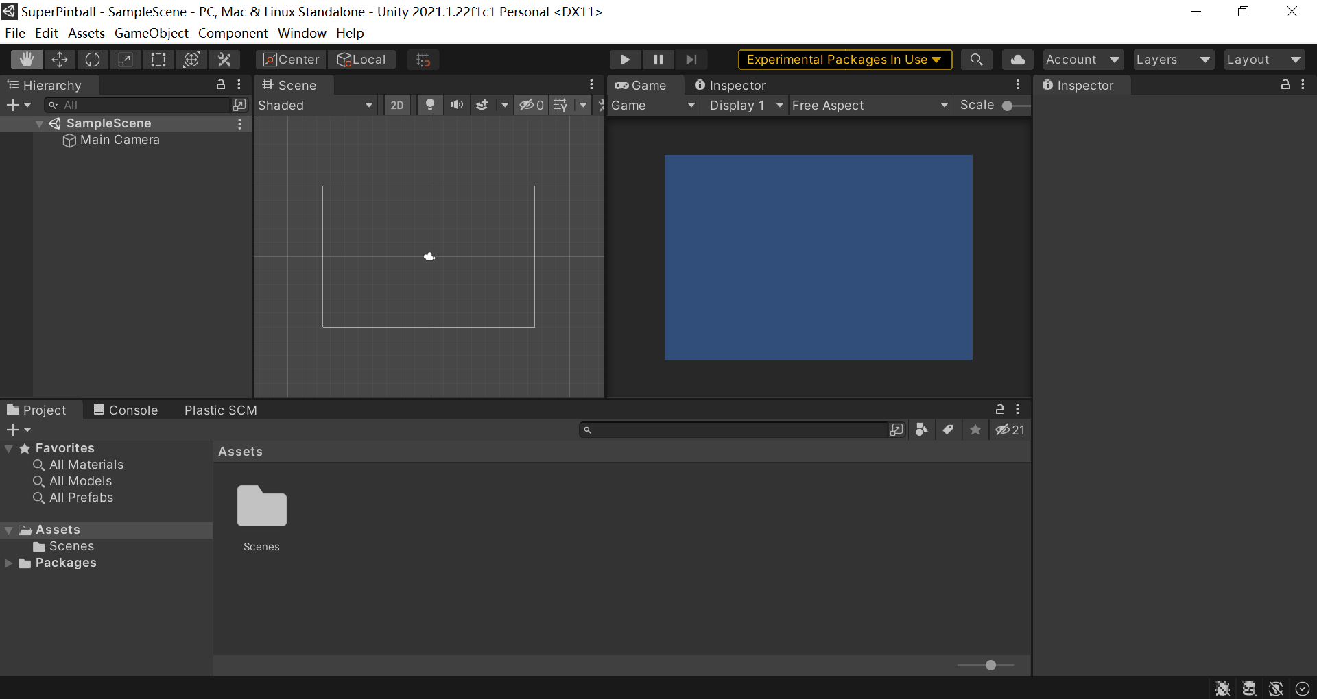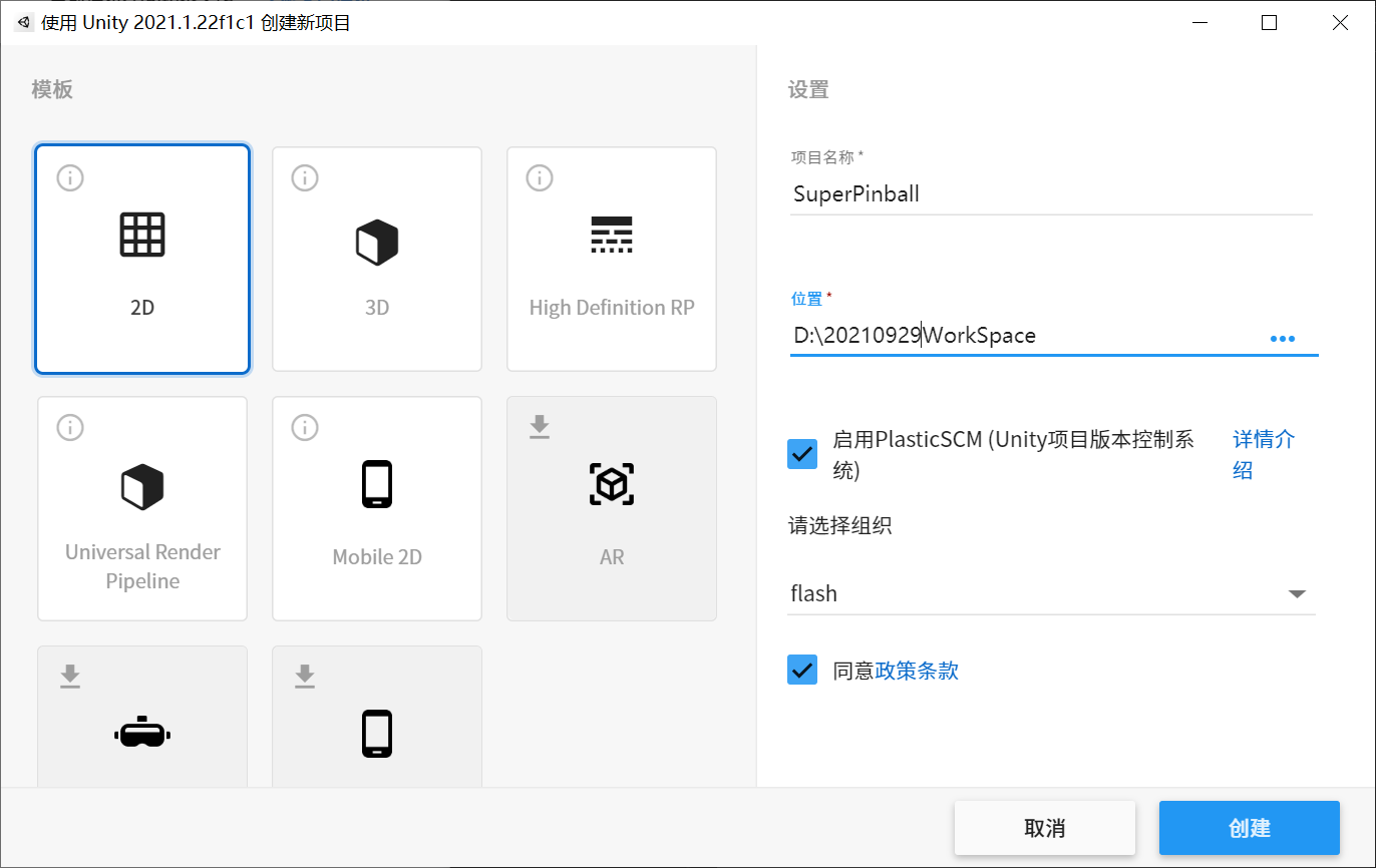打开Unity Hub,新建项目,项目名称:SuperPinball。