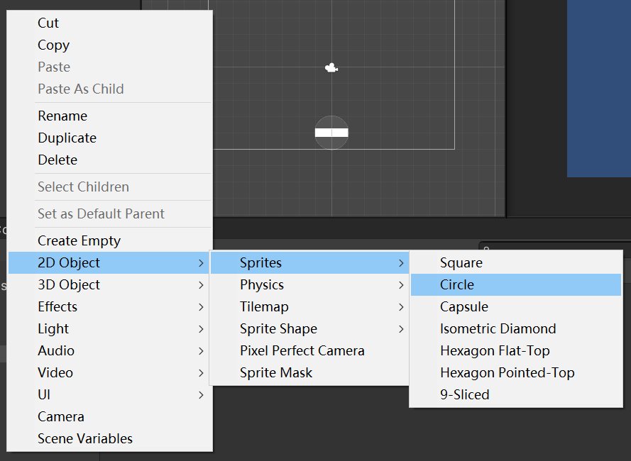 在Hierarchy->右击->2D Object->Sprites->Circle, 新建一个“Circle圆形”: