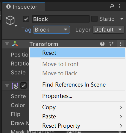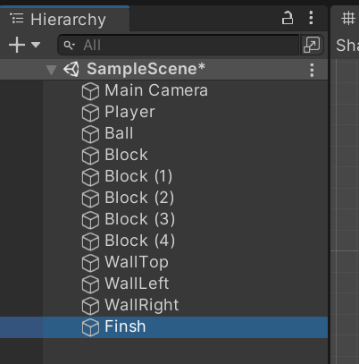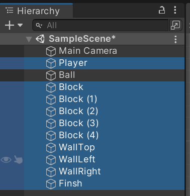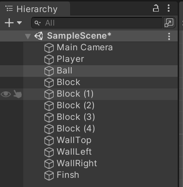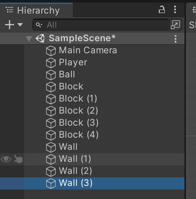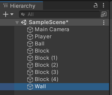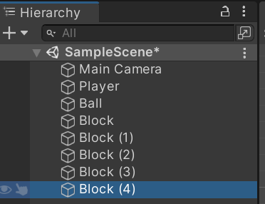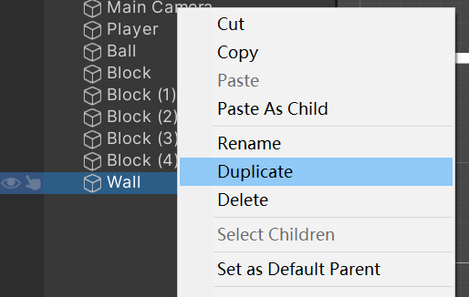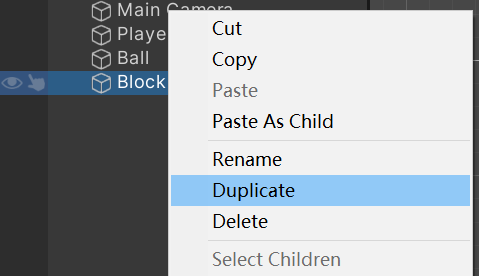 复制砖块,复制出4个一样的砖块: 选中Hierarchy->Block, 右击->Duplicate4次