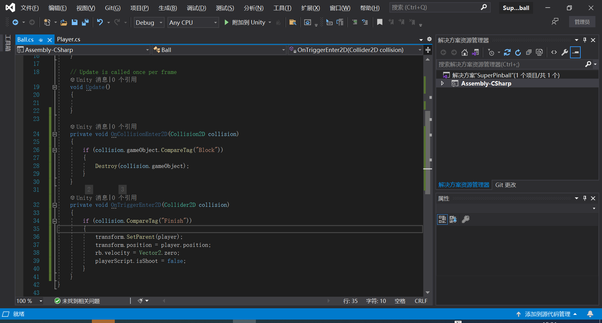 增加代码,为Ball增加“消灭砖块”及“游戏失败重新开始”功能: using System.Collections; using System.Collections.Generic; using UnityEngine; public class Ball : MonoBehaviour { Transform player; Rigidbody2D rb; public Player playerScript; // Start is called before the first frame update void Start() { player = transform.parent; rb = GetComponent<Rigidbody2D>(); } // Update is called once per frame void Update() {