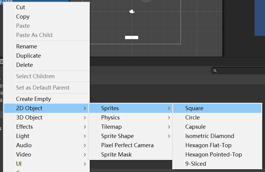 在Hierarchy->右击->2D Object->Sprites->Square, 新建一个“square方形”: