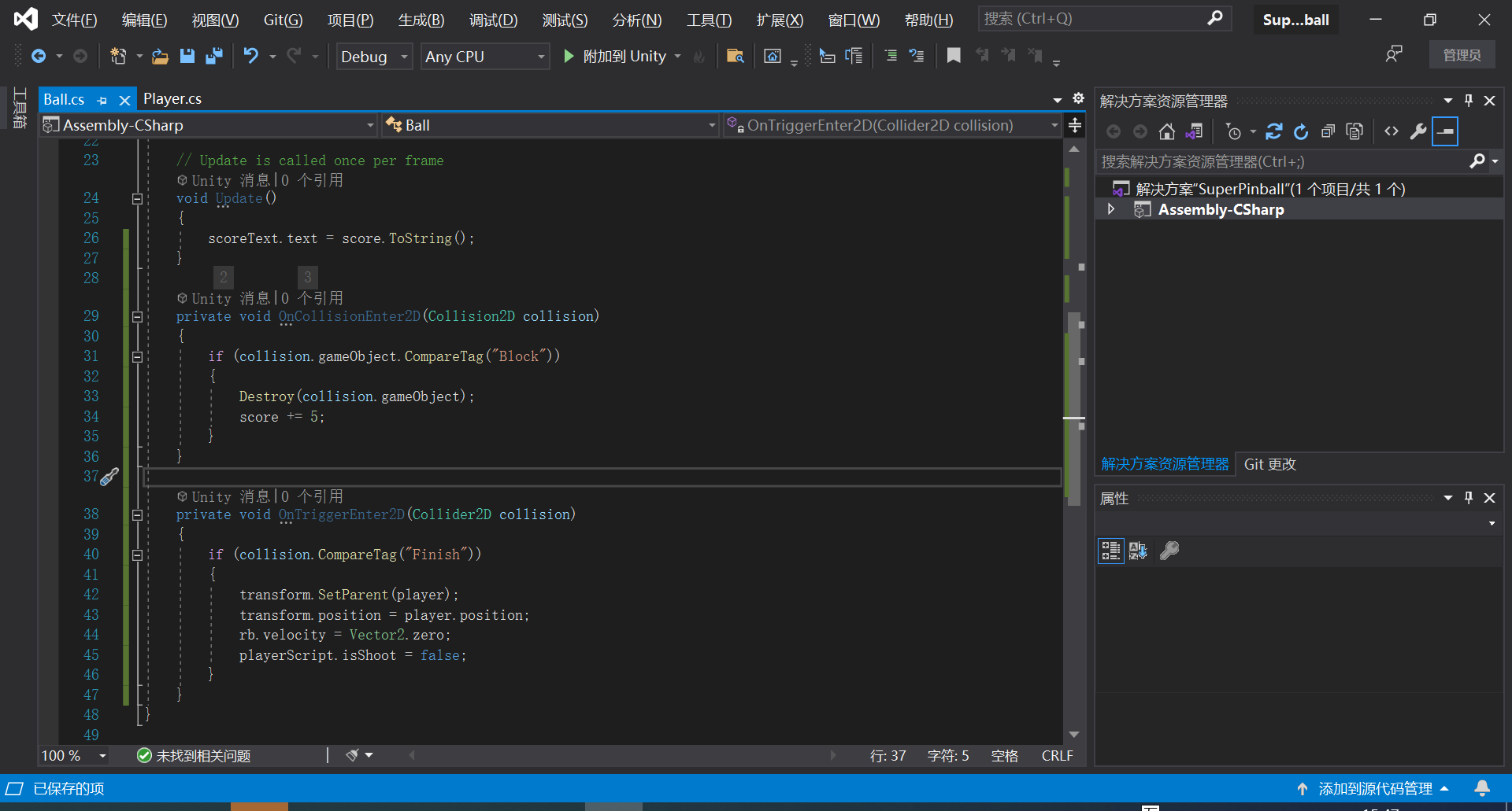 修改Ball的代码, 增加UI实时显示分数的功能: using System.Collections; using System.Collections.Generic; using UnityEngine; using UnityEngine.UI; public class Ball : MonoBehaviour { Transform player; Rigidbody2D rb; public Player playerScript; int score; public Text scoreText; // Start is called before the first frame update void Start() { player = transform.parent; rb = GetComponent<Rigidbody2D>(); score = 0; } // Update is called once per frame void Update() { scoreText.text = score.ToString(); } private void OnCollisionEnter2D(Collision2D collision) { if (collision.gameObject.CompareTag("Block")) { Destroy(collision.gameObject); score += 5; } } private void OnTriggerEnter2D(Collider2D collision) { if (collision.CompareTag("Finish")) { transform.SetParent(player); transform.position = player.position; rb.velocity = Vector2.zero; playerScript.isShoot = false; } } }