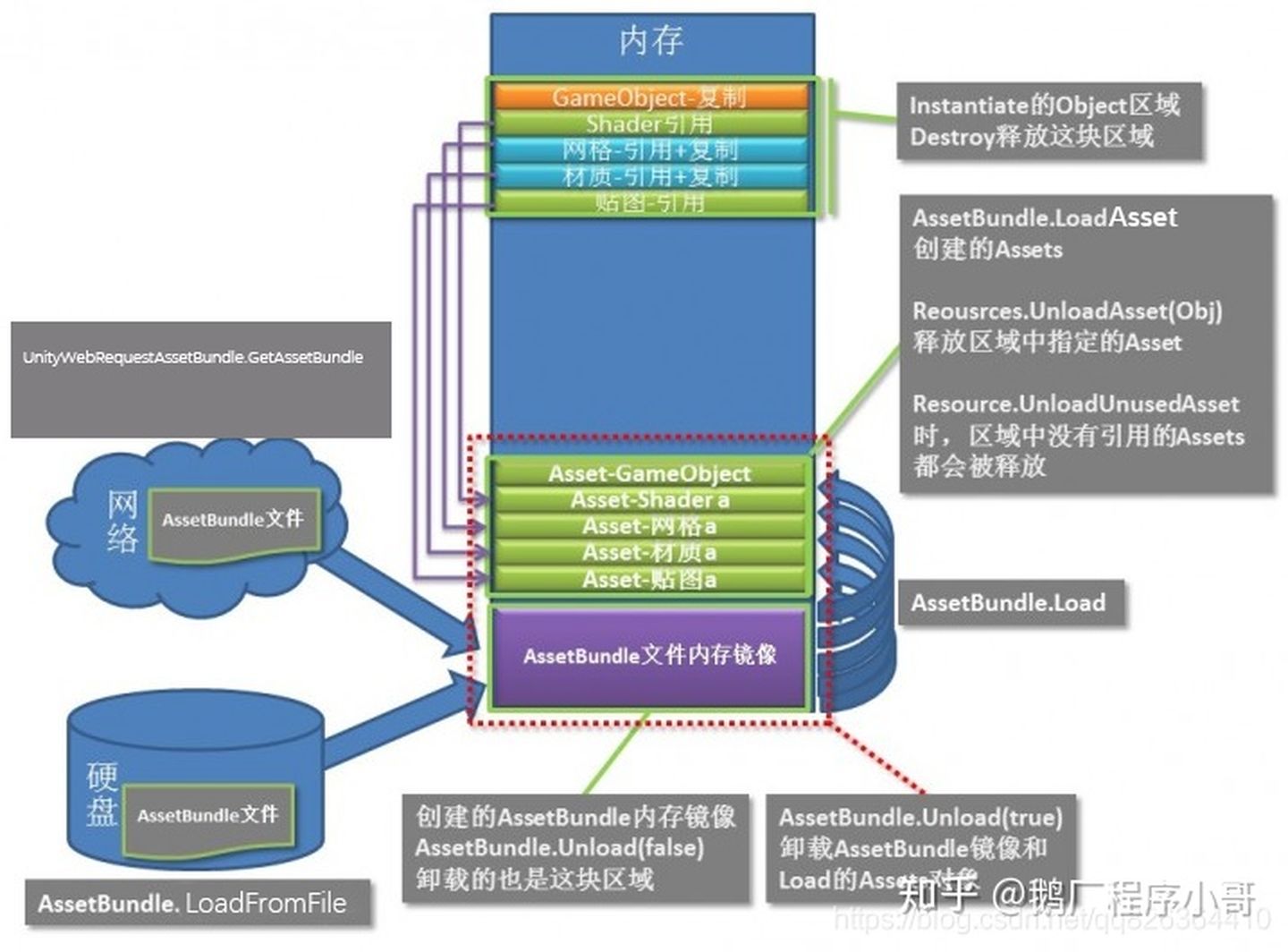 AssetBundle.Unload(false) 仅仅销毁AssetBundle对象包含的资源,任何从此包中加载的实际对象保持不变。当然,也将无法从此AssetBundle包中加载任何其他对象。
