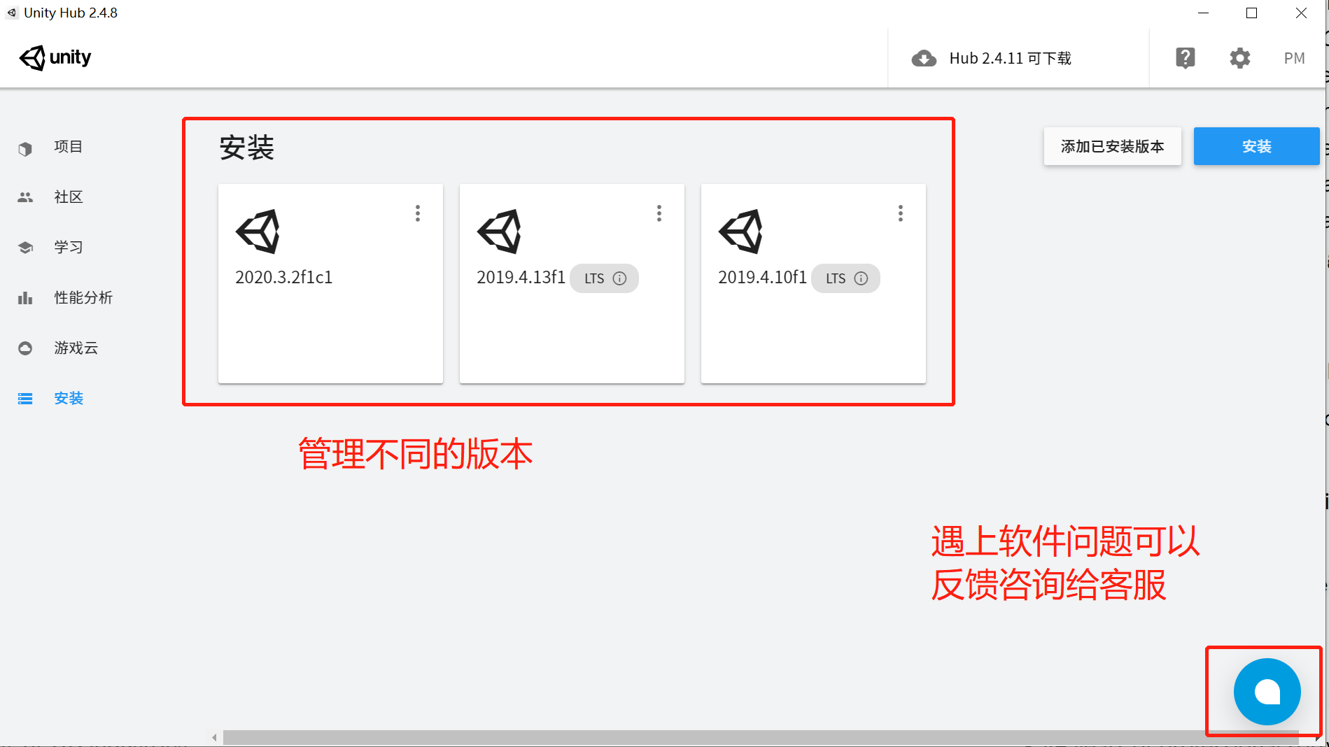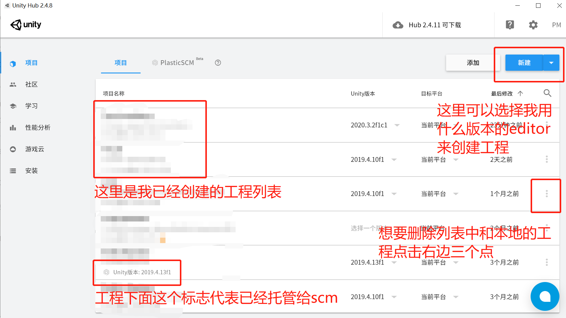 unity的一切基本都可以通过unity hub来管理。例如,我下载了很多个不同版本的editor就可以通过hub来有序管理,我可以通过hub来选择某一个版本的editor来创建工程。