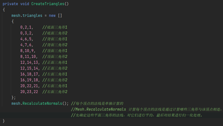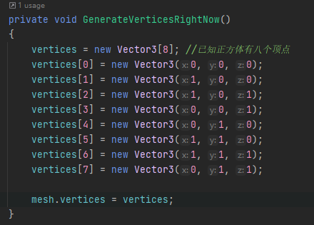 最终效果: 最后提一下法线,法线就是用来进行光照计算的,根据表面的法线方向,可以计算出这个面的明暗程度,这块我们用自带的法线计算看看效果。 代码如图: 加了法线后的Cube效果: 对比上面那个没加法线的是不是效果明显好很多啦? 如果不嫌麻烦,你可以手动给每个顶点加一个法线,也许你会有意想不到的收获哦!今天就写到这里了,跟朋友联机战魂铭人去了!