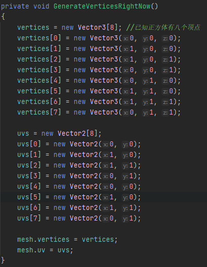 先放一张上一篇文章的截图 看过上一篇文章的同学应该还记得,我们绘制一个3D物体,需要的两个要素vertices、triangles,也就是顶点和三角形,顶点用来确定立方体的四个顶点,三角形用来组成3D物体的表面mesh,这次我们就需要第三个要素了,uv,也就是纹理坐标,在给uv坐标赋值之前,我们先了解一下纹理贴图坐标系。
