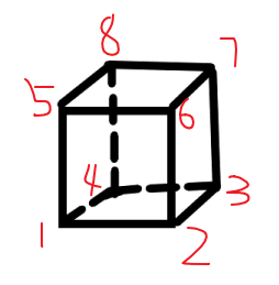 借用一下上一篇的图 代码中的8个点目前对应图中的数字分别是1 2 3 4 和 5 6 7 8,也就是底面和顶面。那么我们要补齐的是前后和左右四个面。