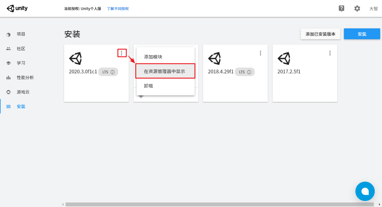 也可以点击Unity Hub中已经安装的Unity菜单,找到安装位置,如下图: