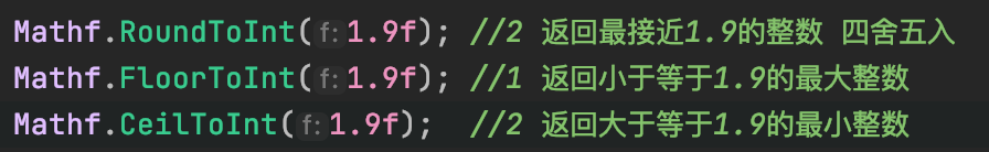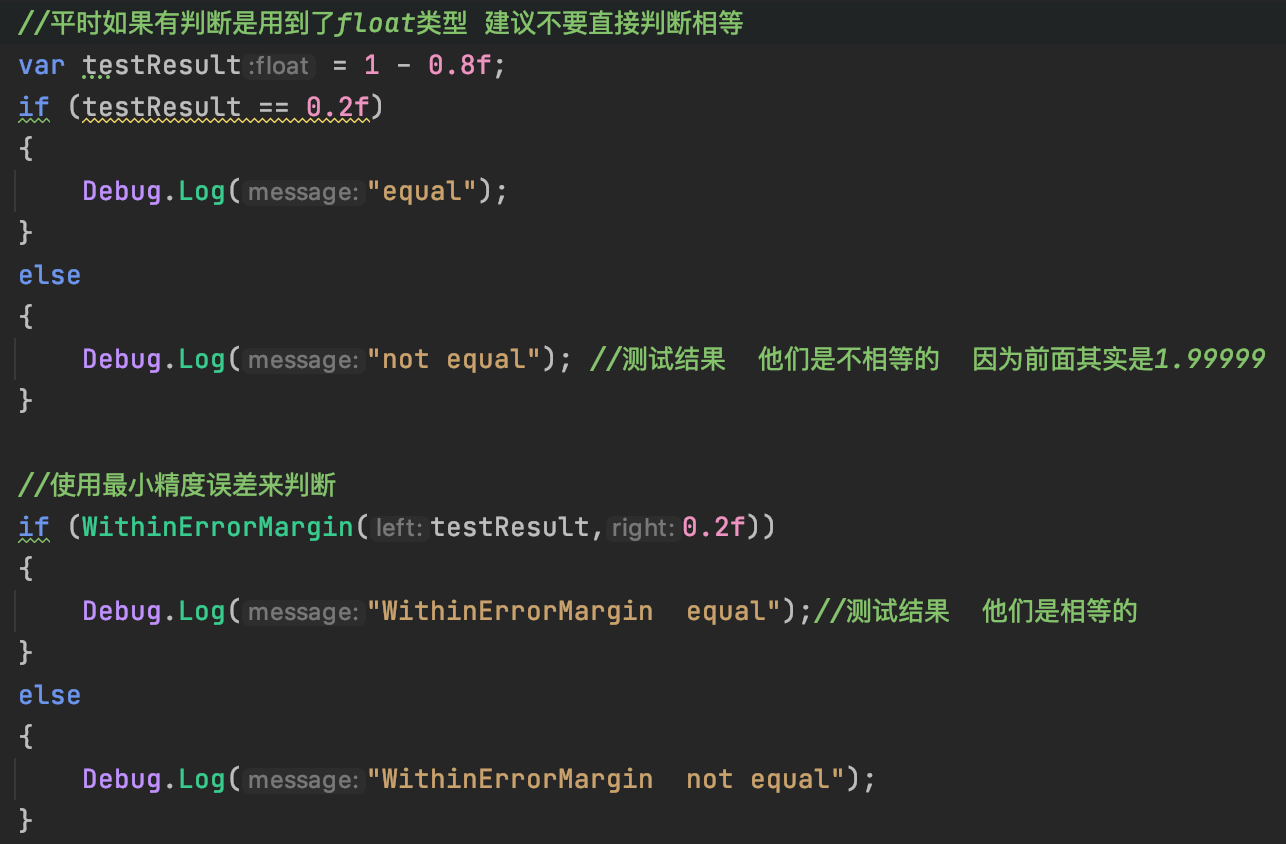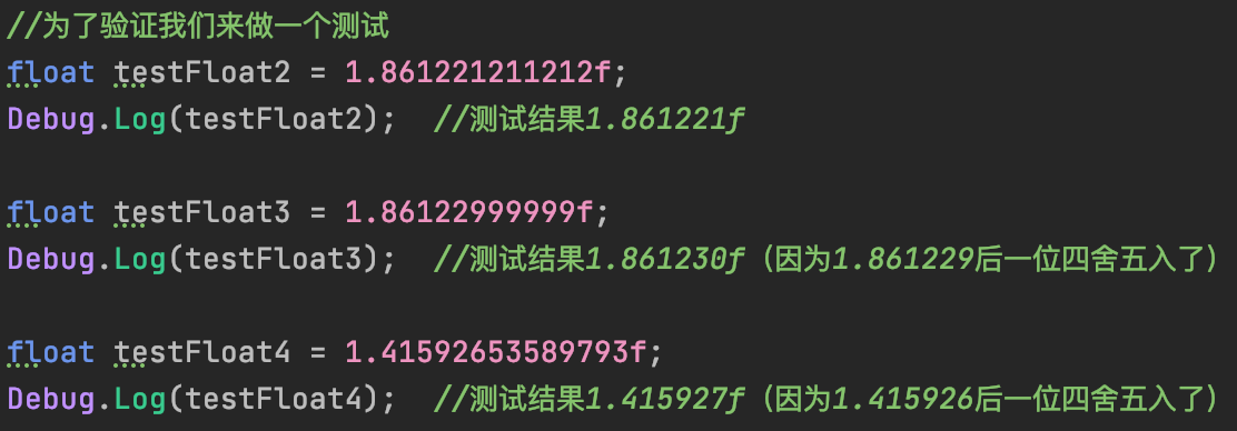 解决问题2: 打印结果是2,那是因为Debug.Log()这个方法,默认是会将小数的后六位截取,然后将第第七位四舍五入到第六位,为此我做了多个测试,为了方便大家理解,我直接把测试代码以及结果放出来给大家看下。 那么,我们再来看一下最开始的那句代码,以及测试结果 这也就是解释了我们怎么打印,这个结果都是2的原因。