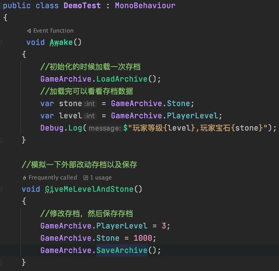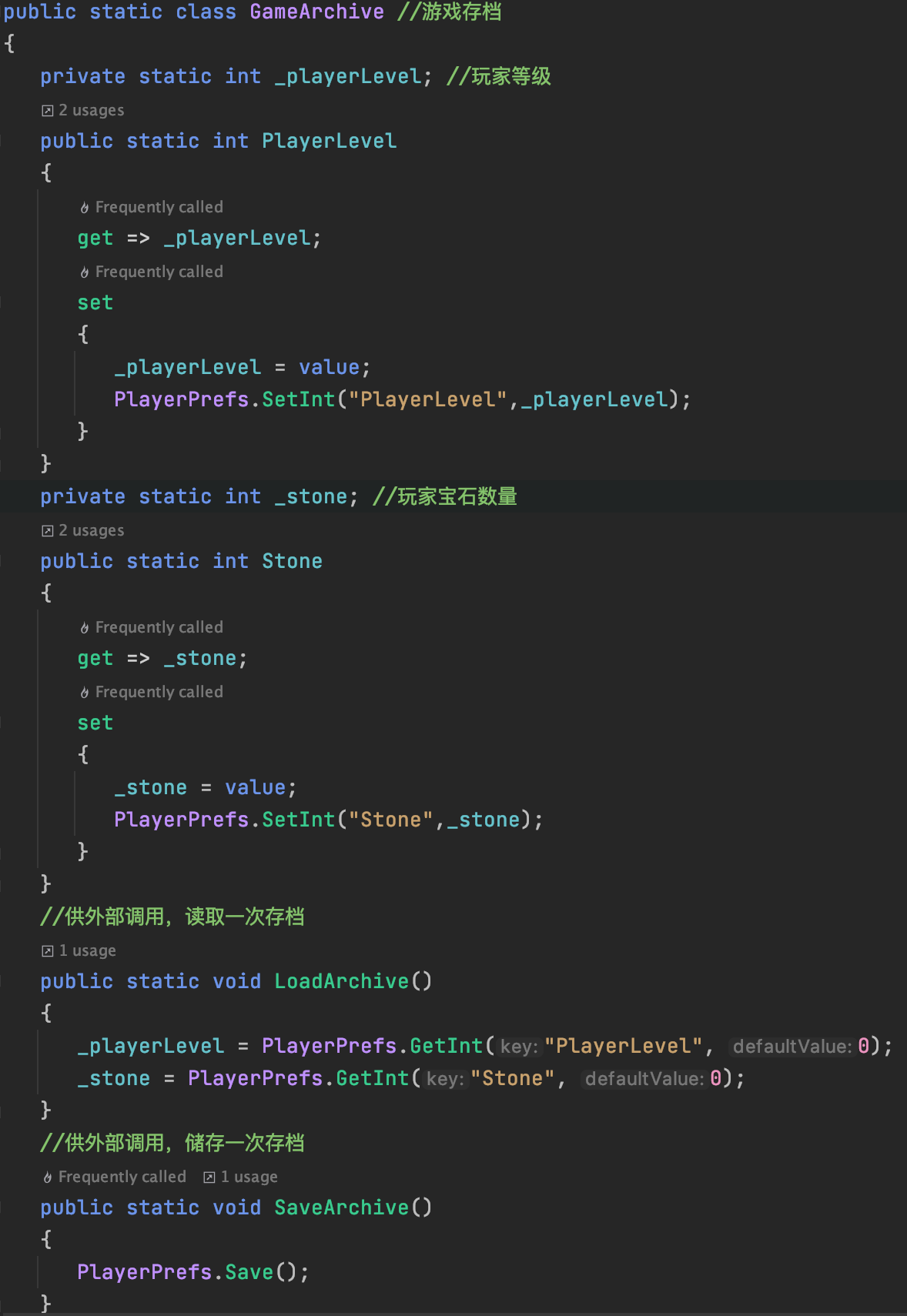 - 静态类适用场景:游戏存档 (单机类轻量级游戏适用,3A大作的那种存档数据量巨大的应该会有其他方案吧,有大佬知道的希望可以在评论区讨教一下) 因为游戏存档是所有地方都需要调用和使用的,那么其实可以用静态类来做管理,读取和保存,我感觉用着还是很方便的,你不需要去操心切换场景是不是要销毁释放,因为存档是一直存在在游戏中的,你随时都需要用来读或者存,尤其是做轻量级单机小游戏,下面我就简单的写一个存档的静态类管理,使用的是Unity自带的PlayerPref类。 顺手把实际用的地方也写一下