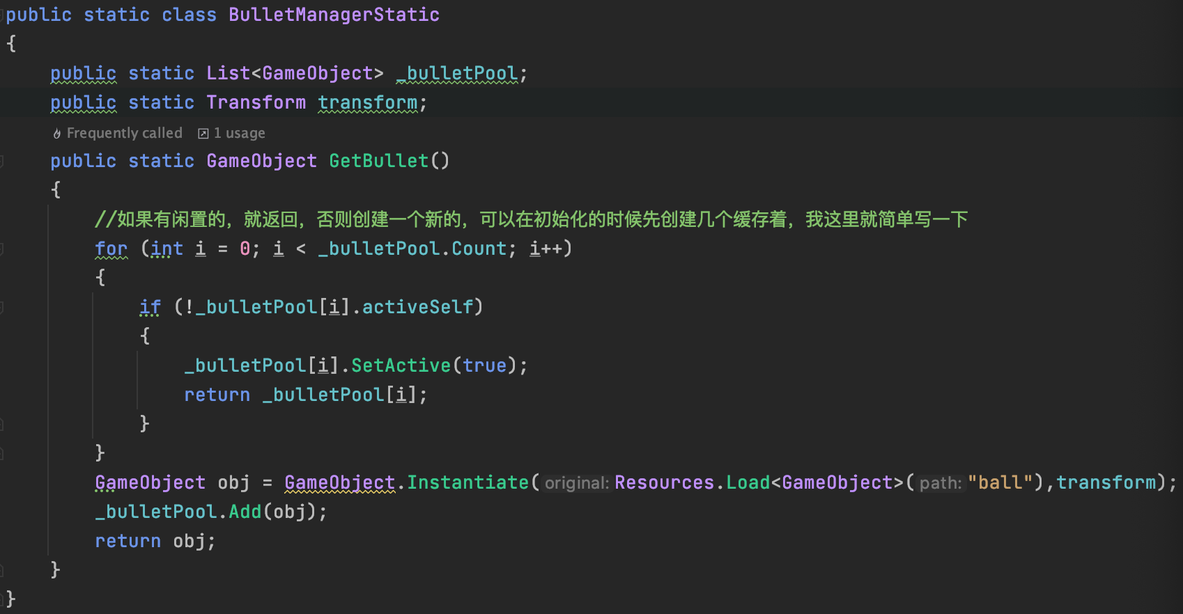 我先来写一个非常简易的子弹对象池的单例类: 那么,如果用静态类能不能做到这个事情呢?能不能也用来管理一个对象池呢?答案是当然可以,接下来我就用静态类写一个,然后分析一下为什么用单例,而不用静态类。 可以看出静态类也是可以完全实现我们的需求功能的,但是,接下来我们一步一步的分析一下为什么静态类不适合作为对象池的管理类。
