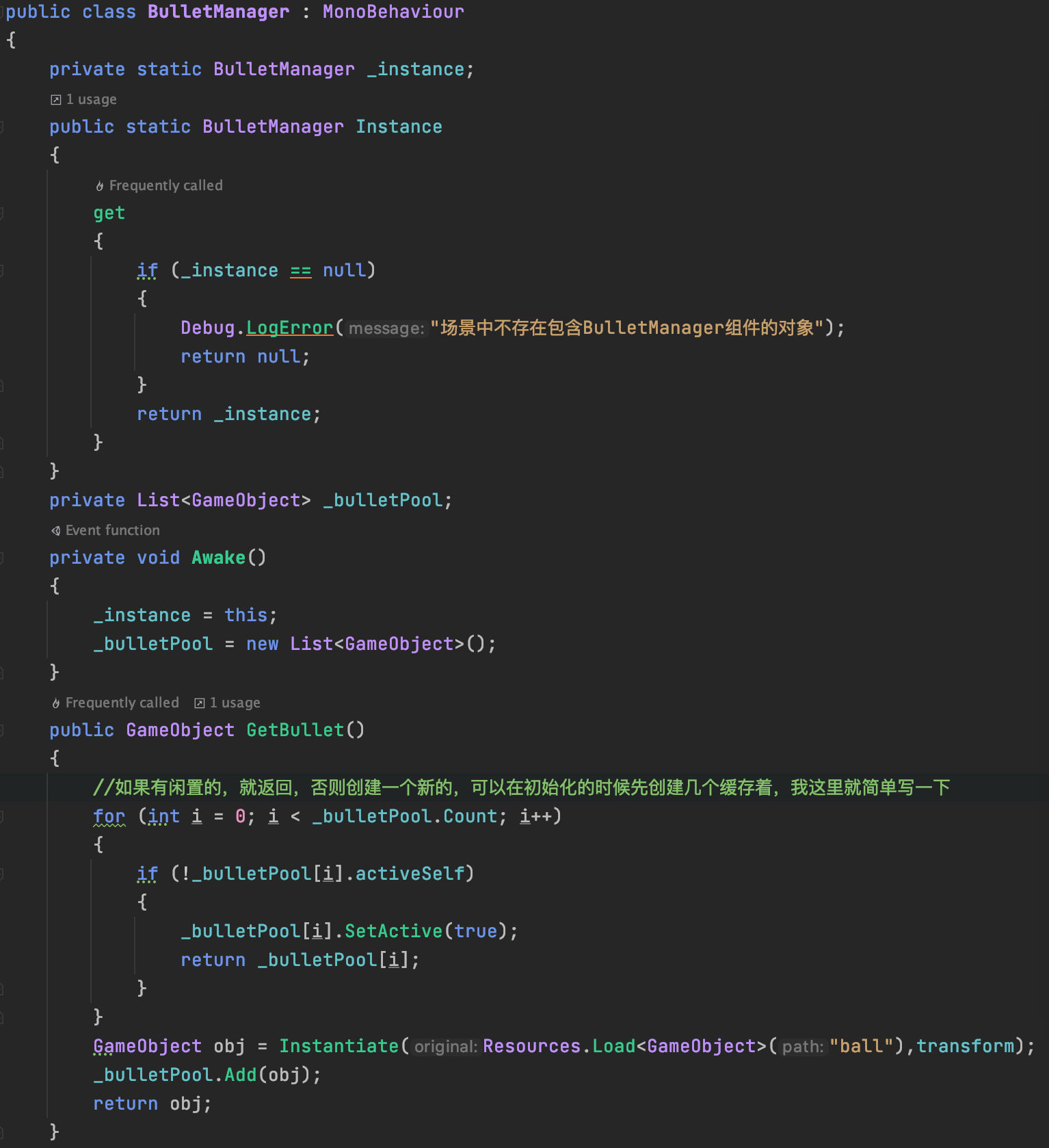 大家在游戏中最常用的一种类就是管理类了,什么GameManager,SoundManager,这些一般都是单例类,我们的目的也就是想要在游戏中只存在一个这样的类,然后通过这个唯一实例化的管理类来进行一些管理行为。那么,静态类不是也是唯一的吗?为啥不用静态类来做呢?我这里就用一个最常用的子弹对象池的管理类来做一个对比分析吧。