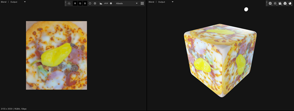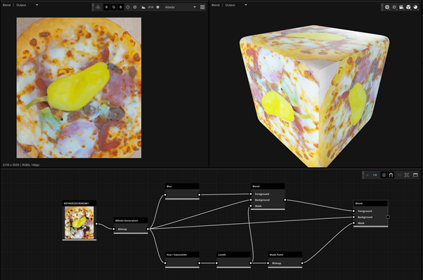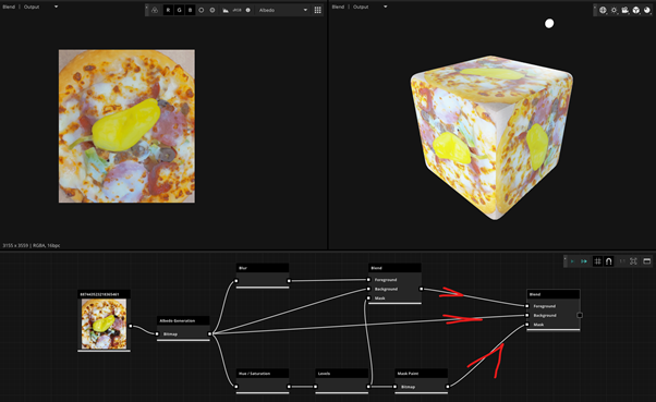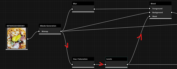接下来我们使用一次Blur节点进行模糊处理,这里的模糊强度我给到了103与上面经过常规Delight操作的贴图相连接。模拟一次全局去高光处理。说到这里大家还记得我在砖墙材质时候也进行了一次模糊操作,当时模拟的是灰尘对粗糙度的影响。 接着我们创建Blend节点,进行我们的第一次混合操作,Blur后的效果与blend的Foreground连接,background与Albedo相连接,别忘了我们的mask。调节参数,到这里我们就得出一张全局去高光的Pizza。