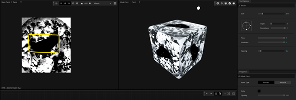 But 这并没有什么难度,怎么办?那我们就创造难度(我只是想多给大家讲下ArtEngine节点的使用)。 别忘了我们是想得到仅仅辣椒处去高光的效果。你可能已经猜到了,我们要创建第二次Mask了,这次玩个新花样,我们创建Mask Paint节点亲自动手来画Mask贴图。调整画笔的size与颜色,这里选黑色(混合后黑色的区域保持不变)。仅仅把辣椒处涂黑。