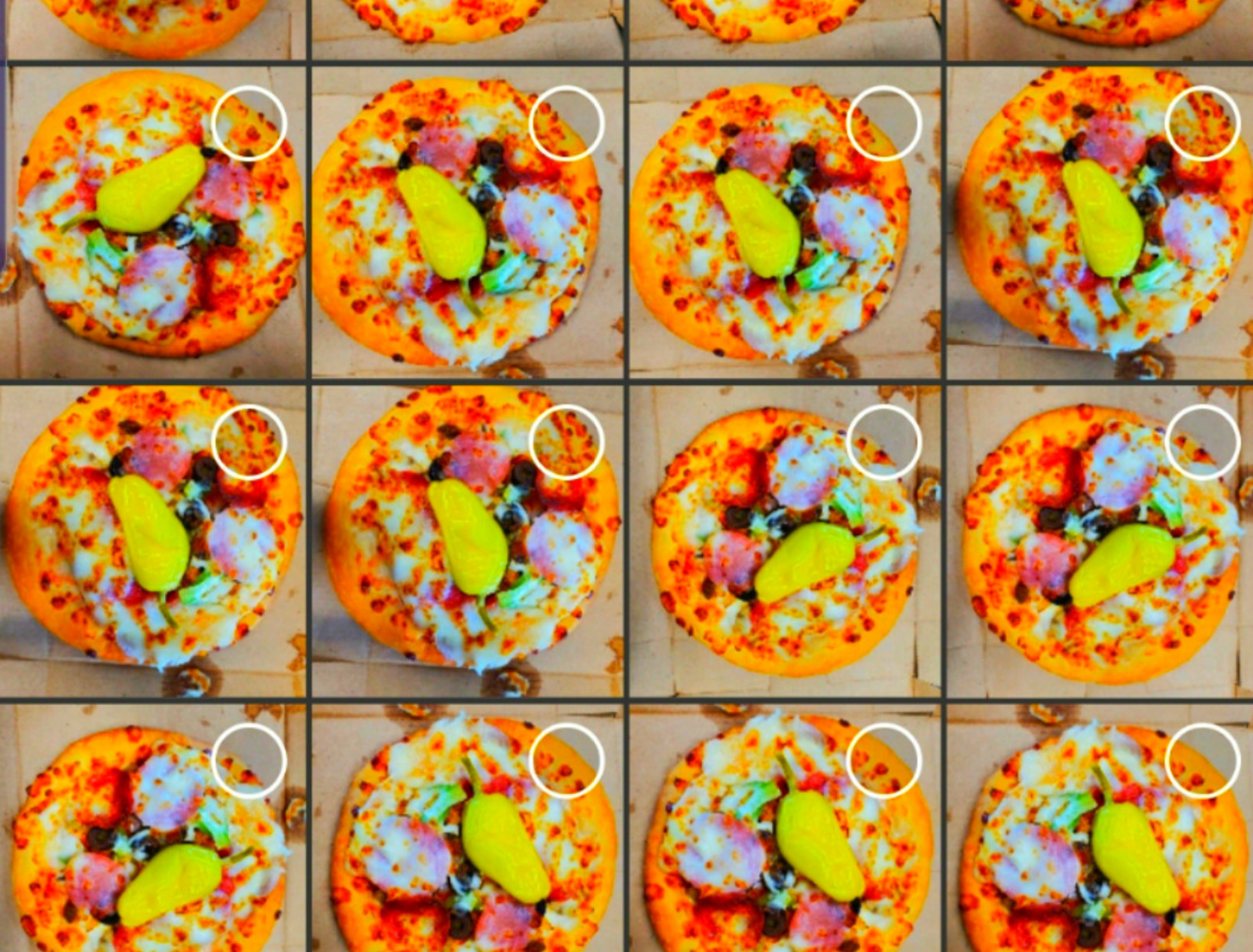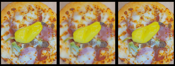 Ok ,到这里我们就得到了最终仅仅辣椒处去高光的pizza了,下图中展示的未去高光与全局去高光以及仅辣椒处去高光的pizza 效果图。