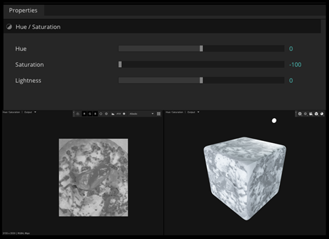 接着我们创建Hue / Saturation/Brightness 色调饱和度亮度节点,调节参数使Saturation降到最低,这样我们会得到一张全灰的照片。