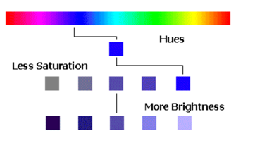 ps:增加亮度与减少饱和度并不相同。降低饱和度会使颜色变成灰色阴影。增加亮度会将蓝色变成更亮的天蓝色,但不会使其变成灰色。