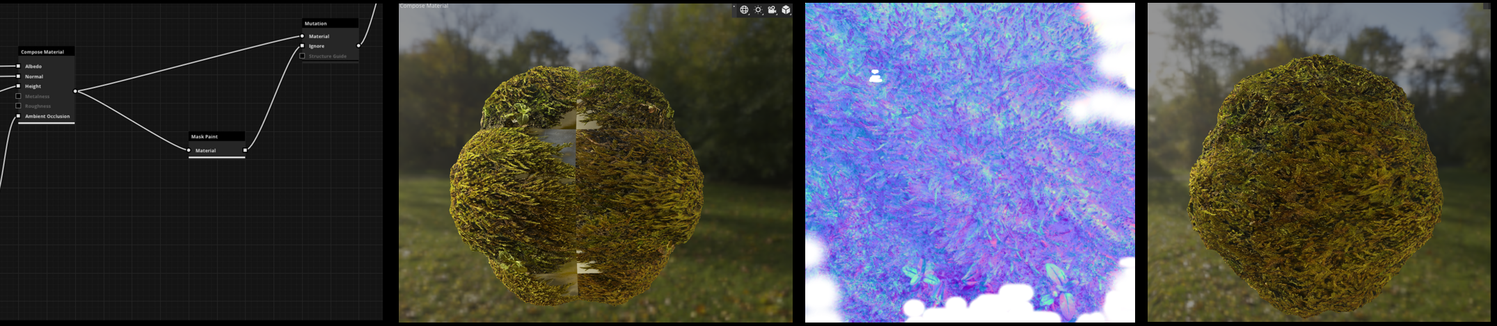 Mask paint 节点是个明星节点;经常与控制突变的Mutation节点和与接缝去除的Seam Remove节点以及控制混合的blend 节点配合使用;下图是在树皮苔藓材质里面Mask paint 与Mutation配合进行智能填充。