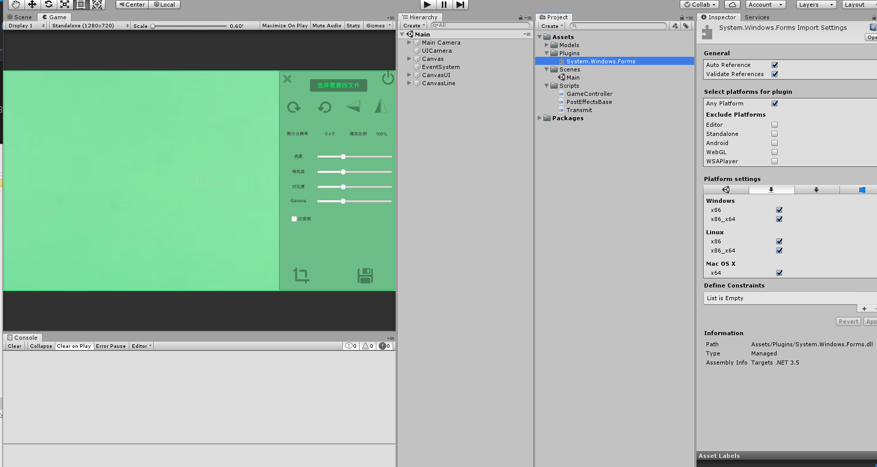 2、特别强调说明一下实现选择图片的功能。主要是System.Windows.Forms.dll引用库的获取,需要在Unity安装目录\Editor\Data\Mono\lib\mono\2.0下,挎贝出来,然后放在项目Assets/Plugins文件夹下。接着需要在Edit -> Project Settings -> Player->Other Setting中的API Compatibility Level选择为.Net 2.0。