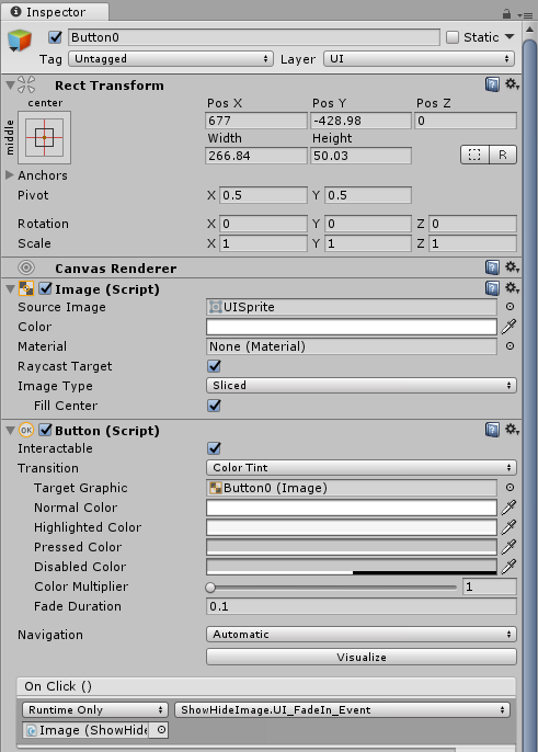 5.将渐隐、渐现的功能绑定到场景中的按钮上,如下图所示:
