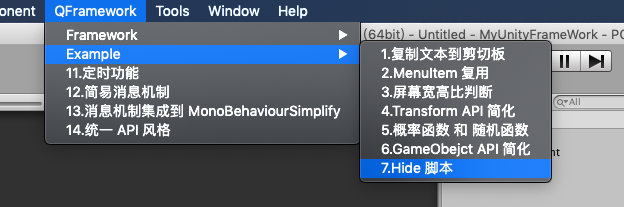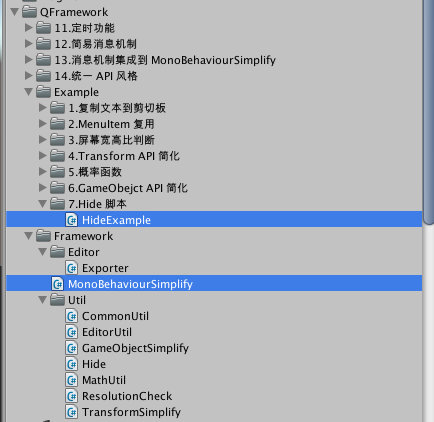 第十个示例,是我们的 MonoBehaviourSimplify,它是我们框架的核心,我们把它拆分到 Framework 目录下,它的示例代码 Hide,其实是一个可以独立使用的脚本,在做调试的时候是非常使用的,而这个 Hide 是可以独立运行的类,所以也放在 Util 目录里。