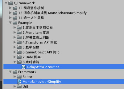 又一个 MonoBehaviourSimplify,我们可以考虑和之前的示例进行合并。而我们的 DelayWithCoroutine 这个示例要放在 Example 里。