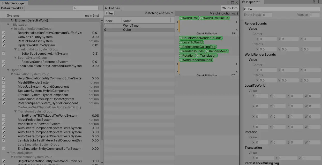 那如何查看这个Cube上面的信息呢?这时候需要使用Entity Debugger。打开方式是:Unity菜单栏Window > Analysis > Entitiy Debugger。
